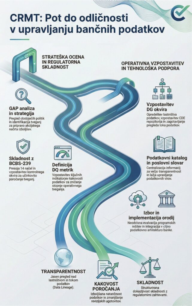 CRMT s svojimi bogatimi izkušnjami v bančnem sektorju, od implementacije analitičnih sistemov do regulatornega poročanja, ponuja celovito podporo pri vzpostavitvi robustnega okvira za upravljanje podatkov (Data Governance).